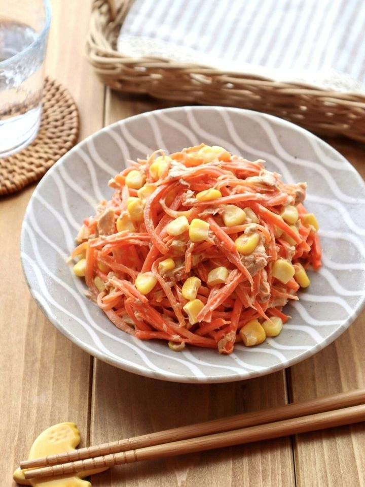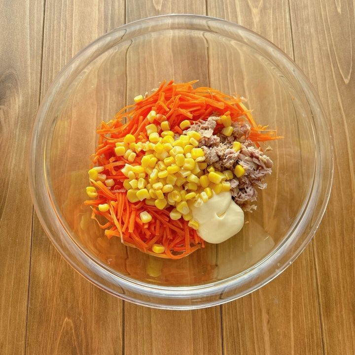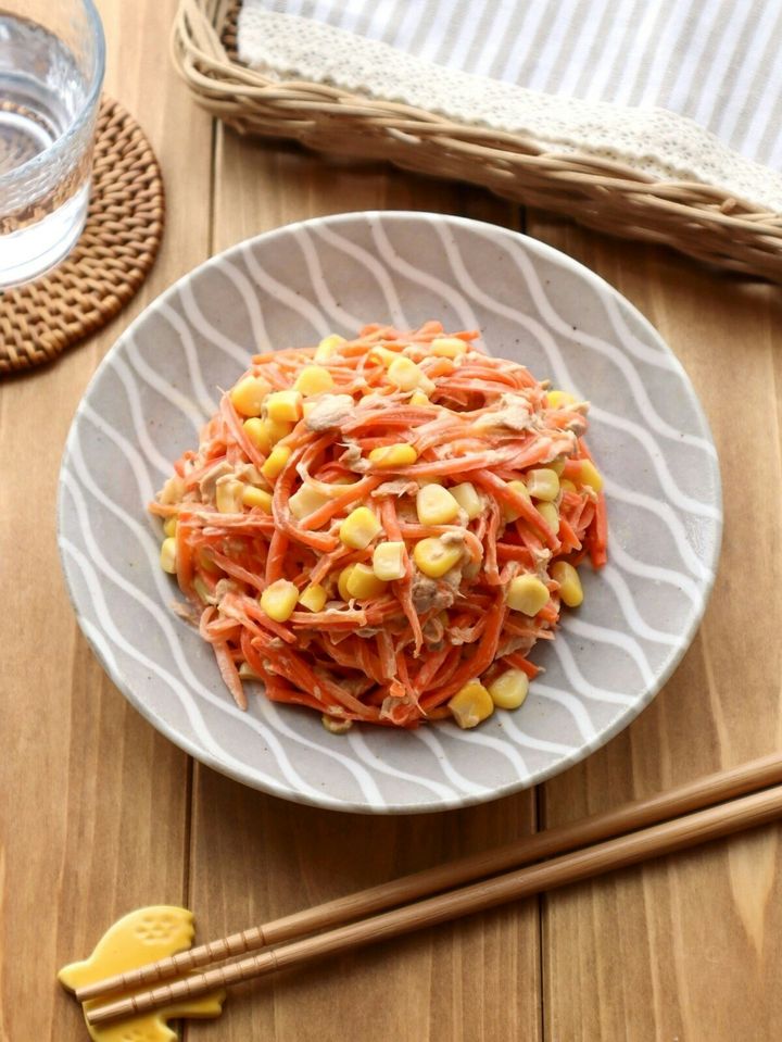 3. プチプチ食感で手が止まらん!「ツナマヨコーンにんじん」レンジで1回加熱だけの楽レシピ