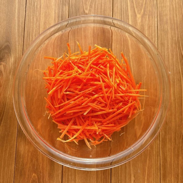 にんじんは細切りにし耐熱容器に入れ、ふんわりラップをして600wで2分30秒加熱し、水気をペーパーでしっかりと拭く。底の方にも水がたまるので注意。