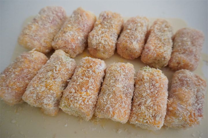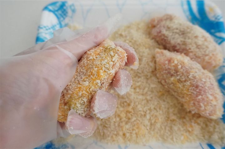 揚げる途中で破けないように両端まで衣をしっかりまぶします。