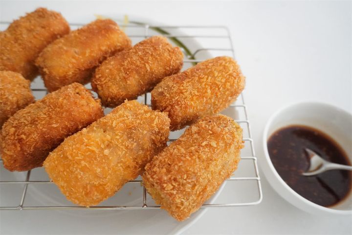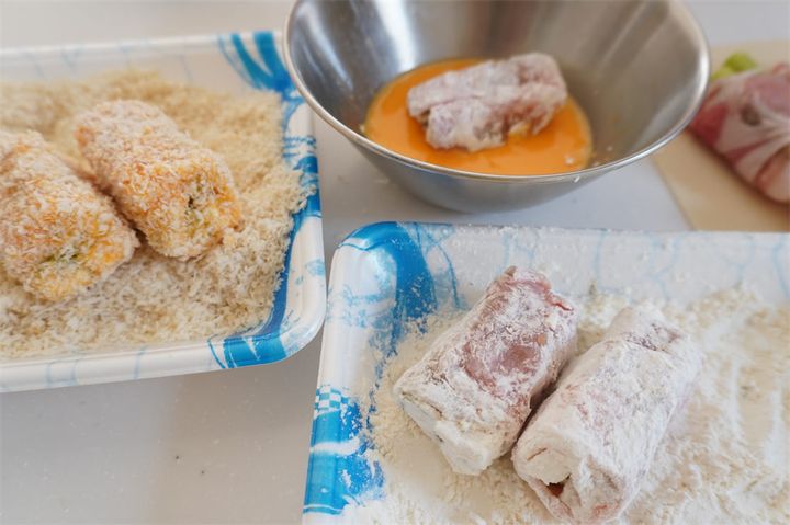 4.揚げ油を180℃に熱し、巻きカツを入れて4~5分揚げる。