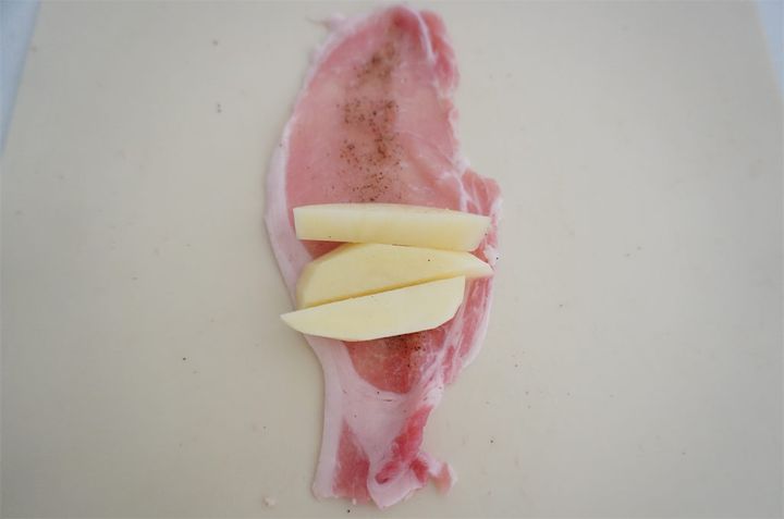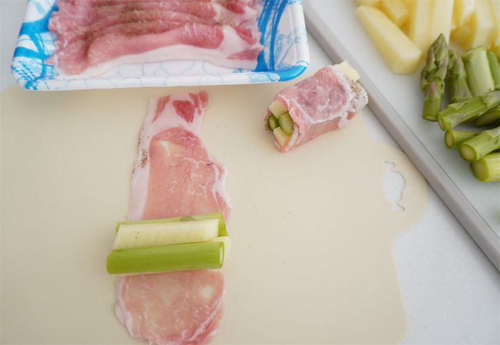 2.豚肉を広げて塩、こしょうをふり、アズパラガスとじゃがいもを2個ずつのせて巻く。
