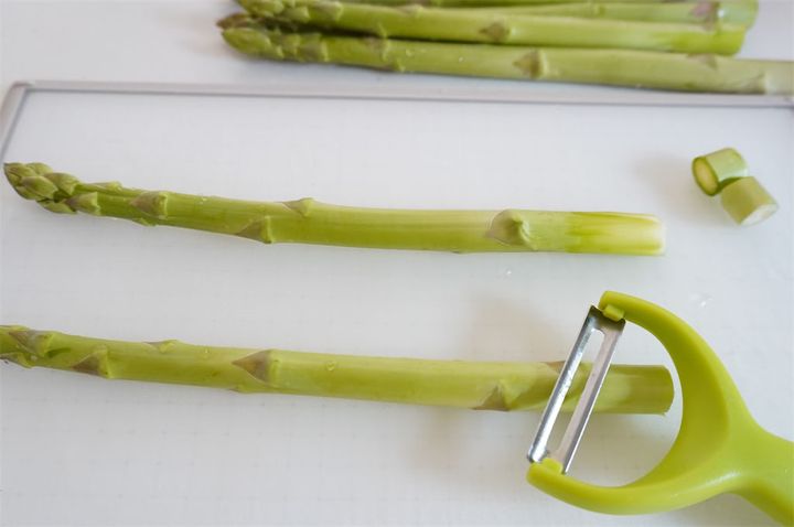 アスパラガスは下の方は固いので根元を1cm切り落とし、根元を3cmほどピーラーで皮を剥きます。
