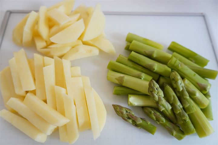 アスパラガスとじゃがいもは5~6cm長さに切りました。余ったじゃがいもの切れ端(画像左上)は素揚げにしたり、豚肉(分量外)で巻いて揚げてくださいね。