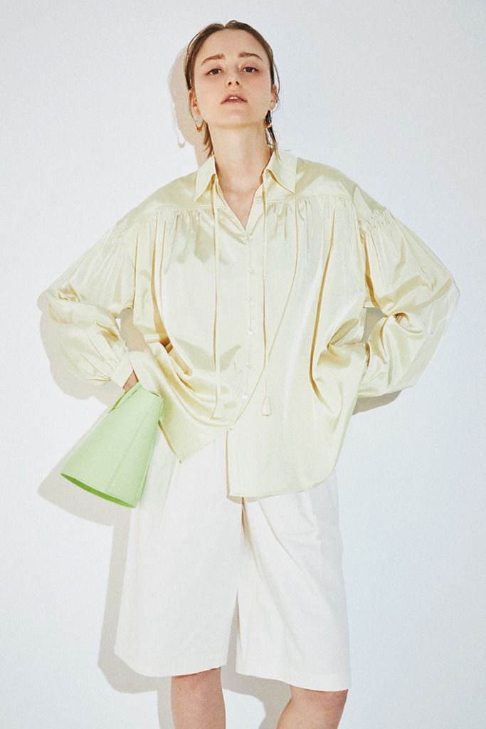 「下は軽く・上は重く」の美バランスな法則にならい、今季豊富なショート丈ボトムをはくときは、ボリュームスリーブのブラウスがねらい目。シルエットによる立体感とともに細かなタックで女らしさも足せるから、ラフな丈が品よく整う。