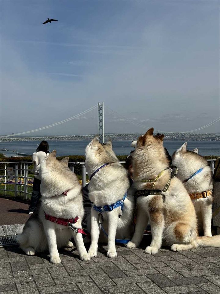 後ろを向くシベリアンハスキーたちの姿に反響