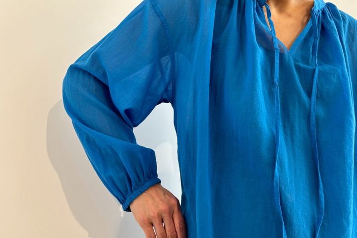 「袖口にゴムが入っているからたくし上げても留まりやすく、ニュアンスのあるボリューム袖が楽しめます。あとは、この上品な透け感ですね!」