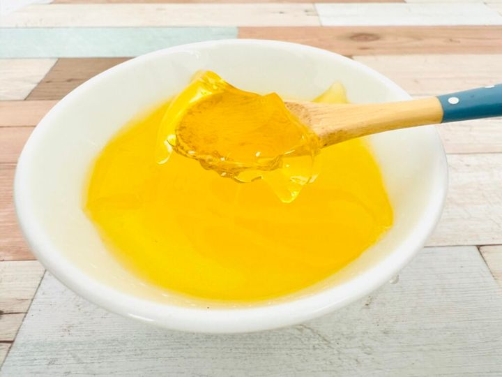 ゼリーを器に出そうとすると、板こんにゃくのようにズルンと1枚で出てきます。スプーンなどでひとくち大に崩して食べるといいですよ。レモンシロップはしっかりとした酸味があります。加える量は自分でお好みに調整できるのもいいですよね。ゼリーに充填されているシロップ液は、フルーツ缶詰のシロップのようにやや甘めなので、レモン味を堪能したい方は、ゼリーの汁気をきってからレモンシロップをかけるとよさそうです。