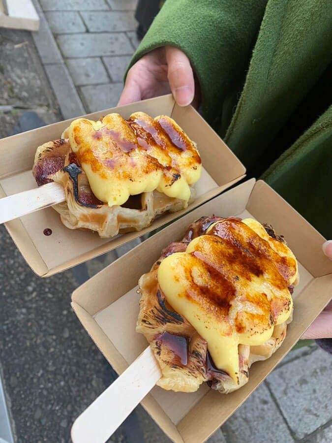 クロッフルは、クロワッサンとワッフルをかけ合わせた韓国発祥のスイーツです! 芋ぴっぴ川越店で販売しているこちらの商品は、もっちり生地の焼き立てクロッフルにカスタードと芋蜜(お芋のシロップ)をトッピングしている、甘くておいしいボリューミーな一品です。芋ぴっぴは1mm絹糸の紫芋アイス、焼き芋も有名なので、今度はそちらもいただきたいです♡