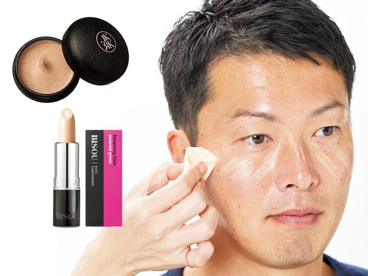 「にきび跡が気になるポイントにレカルカを少量指で塗り、更に赤みが気になる部分には BISOUのエメラルドグリーンでカバー。男性のさりげない肌つくりを」(Saiさん)