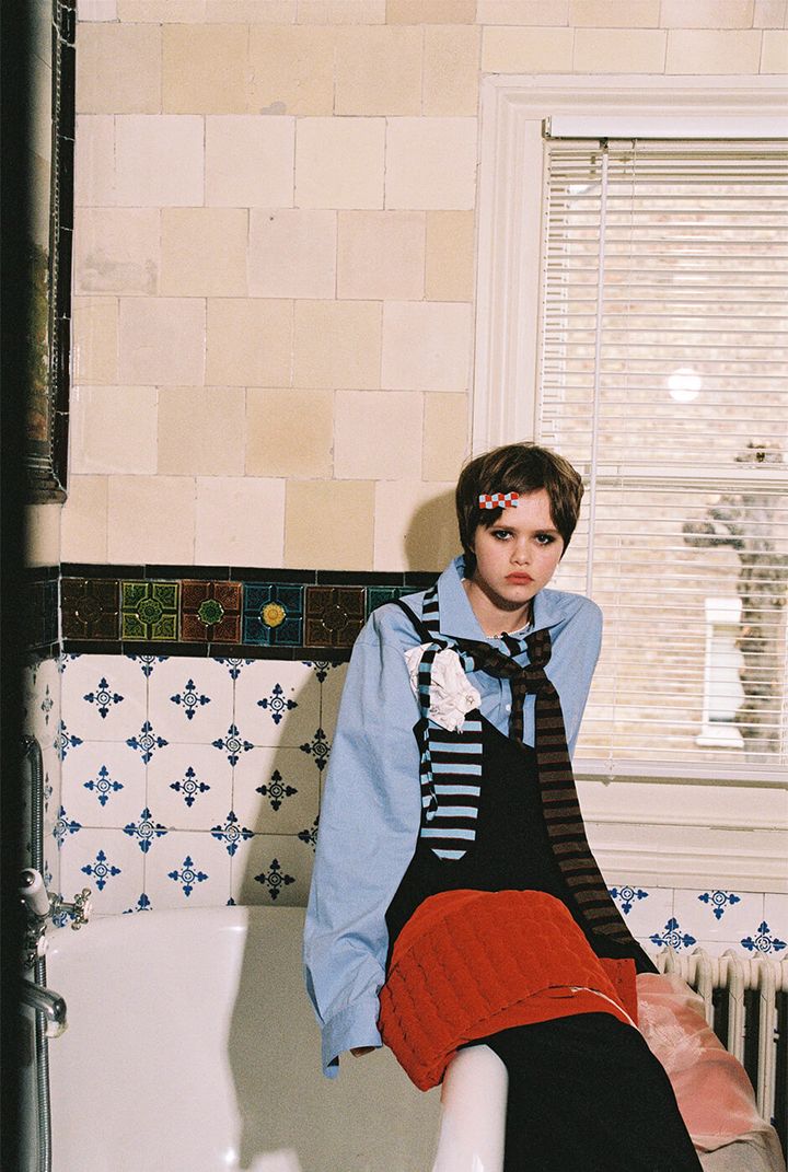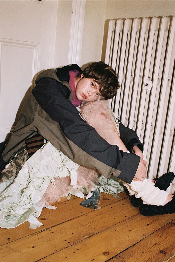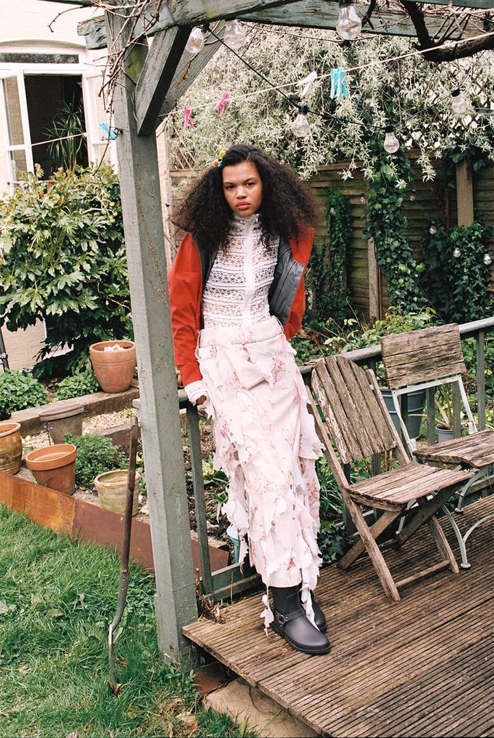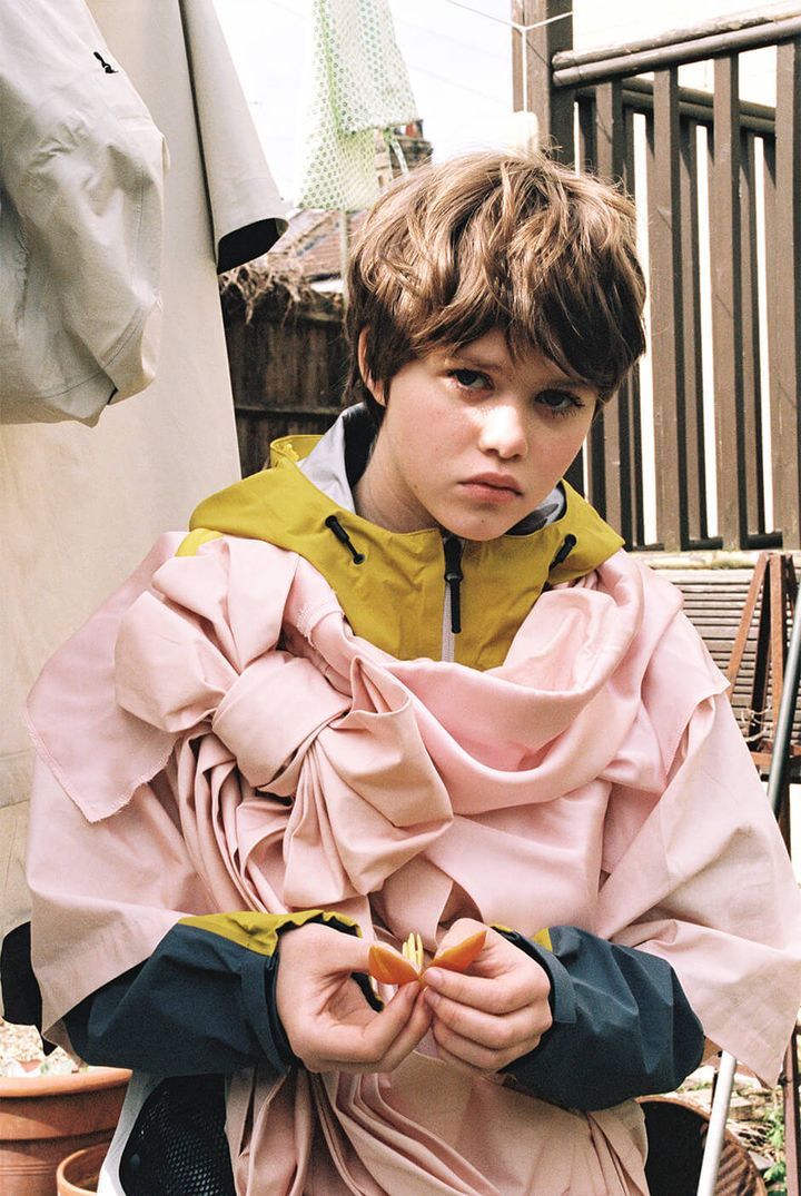 inner jacket ¥53,900 by GOLDWIN GOLDWIN CUSTOMER SERVICE CENTER,cardigan, skirt and harness by MOLLY GODDARD, headdress by PHOEBE PENDERGAST, tights and shoes stylist’s own