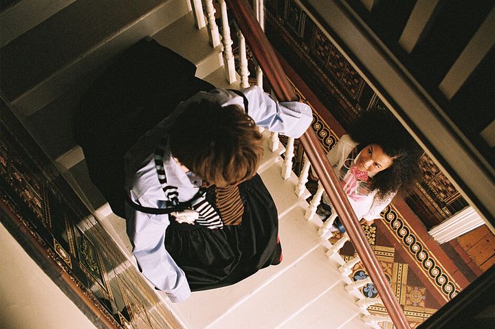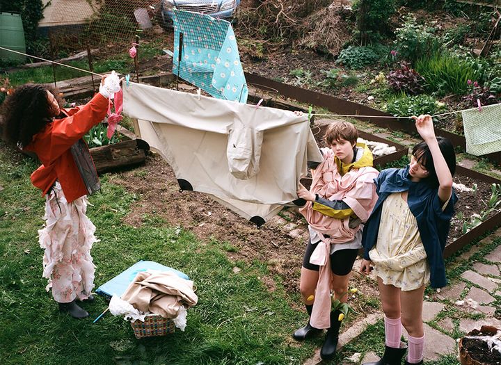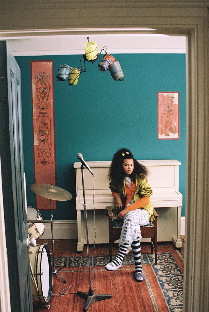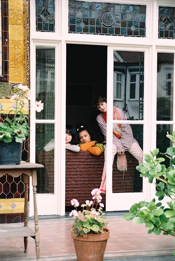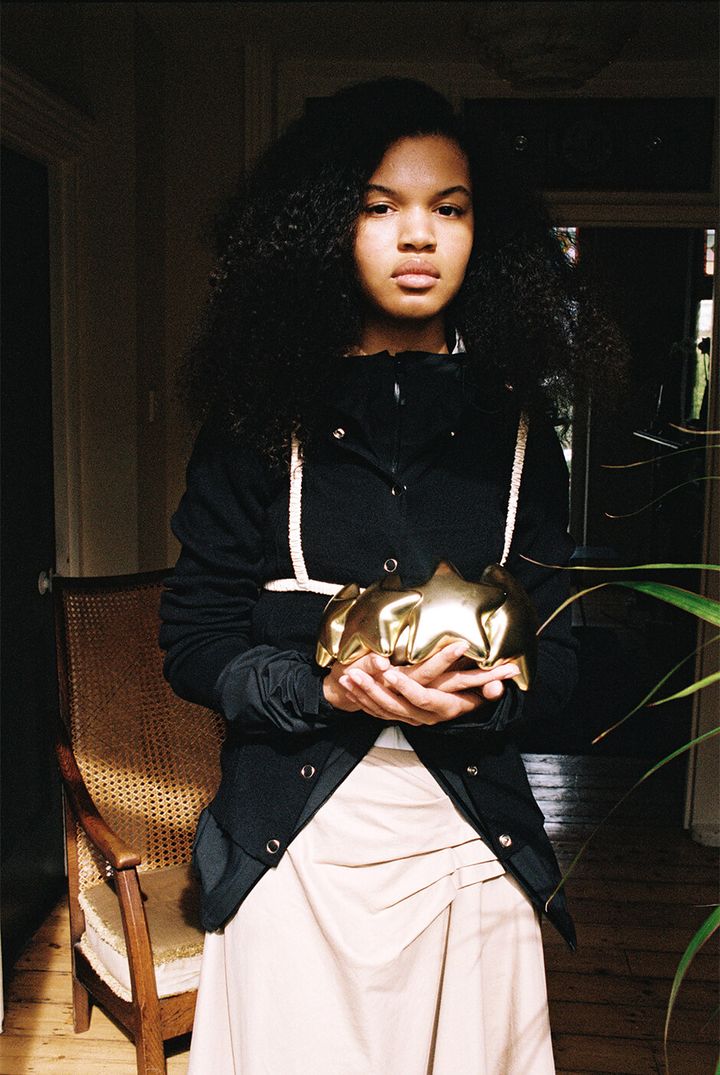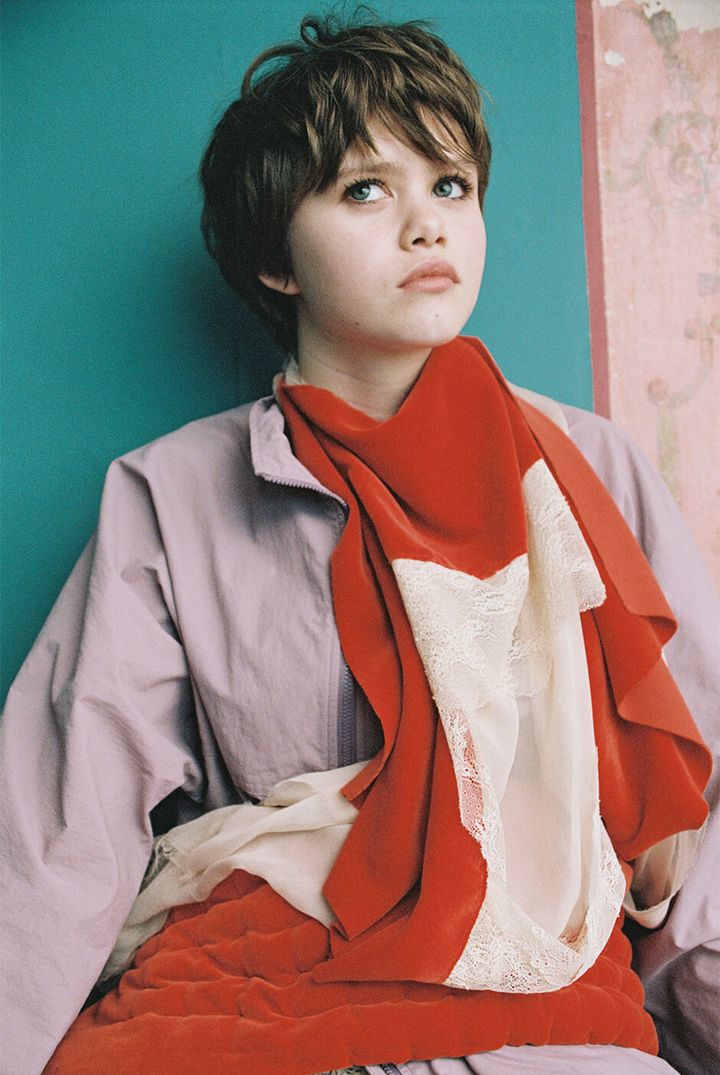 inner jacket ¥53,900 by GOLDWIN GOLDWIN CUSTOMER SERVICE CENTER,cardigan, skirt and harness by MOLLY GODDARD, headdress by PHOEBE PENDERGAST, tights and shoes stylist’s own