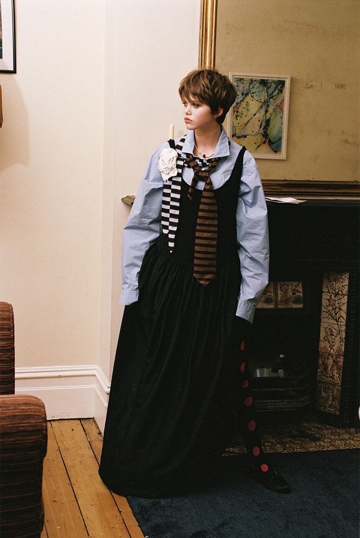 shirt ¥23,100 by GOLDWIN GOLDWIN CUSTOMER SERVICE CENTER,dress by BEVZA, shoes by NEGATIVE THREE, both ties by LAUREN PERRIN, brooch by HORTI, tights and necklace stylist’s own