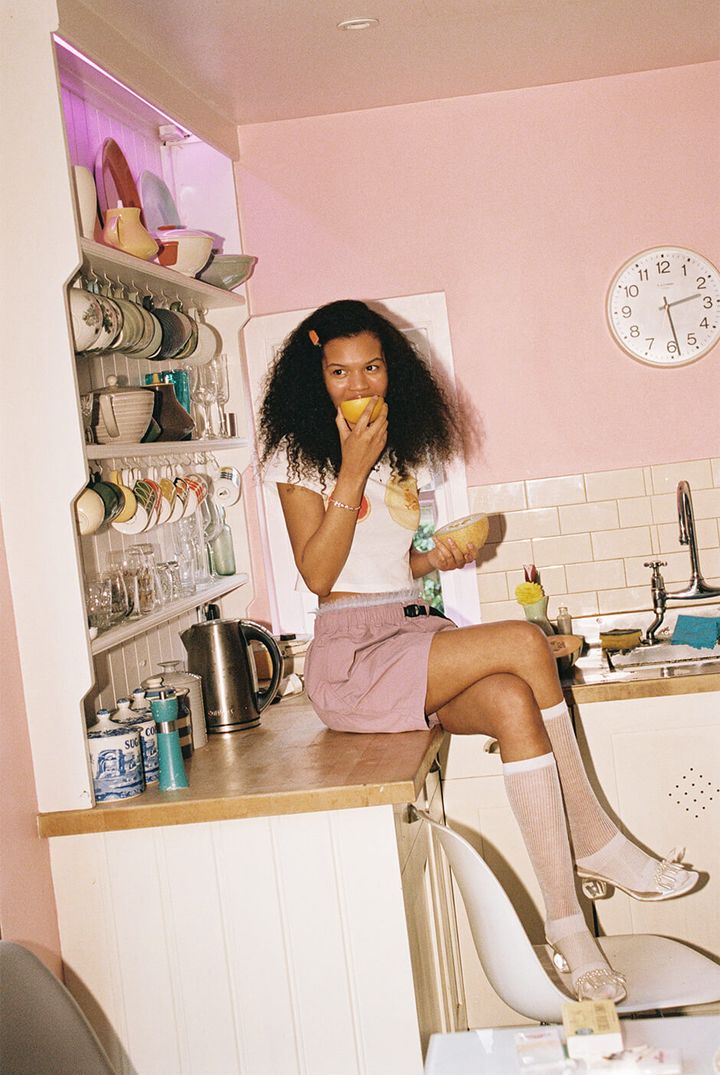 shorts ¥18,700 by GOLDWIN GOLDWIN CUSTOMER SERVICE CENTER,top by A.W.A.K.E MODE, inner shorts by JOYCE BAO, sandals by SIMONE ROCHA, socks, hair clip and bracelet stylist’s own