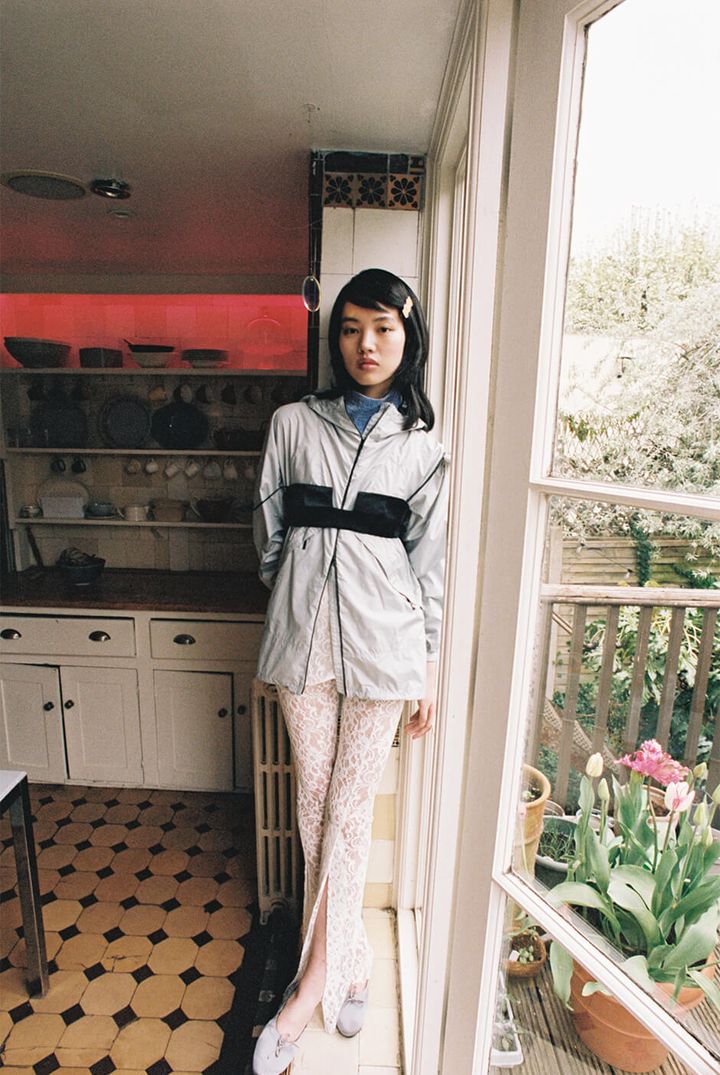 jacket ¥22,000 by GOLDWIN GOLDWIN CUSTOMER SERVICE CENTER,bra by BEVZA, scarf by JOYCE BAO, trousers by A.W.A.K.E MODE, shoes by NEGATIVE THREE, hair clip stylist’s own