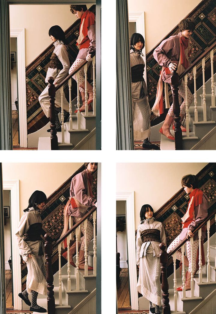 left - shirt ¥23,100 by GOLDWIN GOLDWIN CUSTOMER SERVICE CENTER, dress by BEVZA, both ties by LAUREN PERRIN, brooch by HORTI, tights, necklace and hair clip stylist’s ownright - shirt ¥23,100 by GOLDWIN GOLDWIN CUSTOMER SERVICE CENTER, cardigan by S-BA, trousers by THIS BELONGS TO, shoes by NEGATIVE THREE, both ties by LAUREN PERRIN, brooch by HORTI