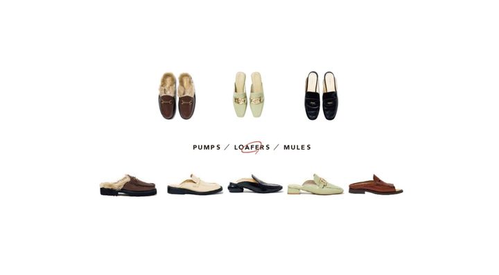 スタイル良く見える前提で選ばれたローファー風スリッパやミュール
