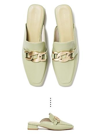グリーン×チェーンデザインシューズ(3) 14,960円/A de Vivre 存在感のあるデコラティブなチェーンの飾りに対し、フォルムは細長くシャープに。白が混じったような、マイルドな色味のミントグリーンは、白ボトムとの合わせにも、黒との合わせもコントラストがつきすぎず、ちょうどいいアクセントに。