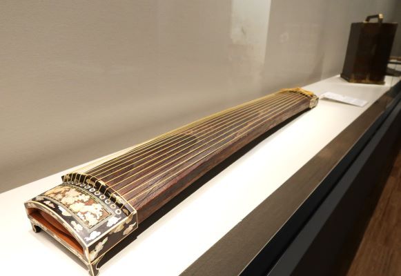 会場には箏や龍笛、笙など宮中雅楽の楽器が展示されていました。 京都御所に伝来した「御在来」の《箏 銘 團乱旋(とらでん)》。「團乱旋」とは伝承が途絶えた雅楽の古い曲名だそうです。