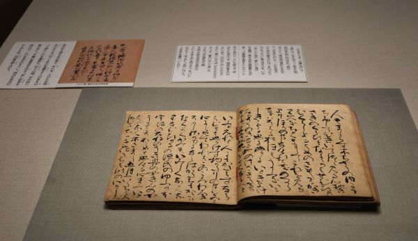 国宝《更級日記》。小倉百人一首で知られる歌人で貴族の藤原定家(ふじわらのさだいえ)が『更級日記』を書写した古写本だそうです。 後水尾上皇の仙洞御所に伝来。後西天皇の御遺物にも含まれた禁裏御所伝来の品と考えられています。 奥書には、定家所持本の紛失により再度書写したとの記載があるそうです。肥痩のある漢字と仮名文字で、筆のかすれもなく、止めや払いの墨は黒々としており、ゆったりした筆運びに見えました。