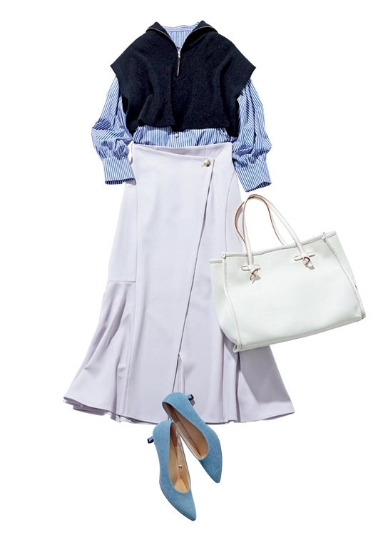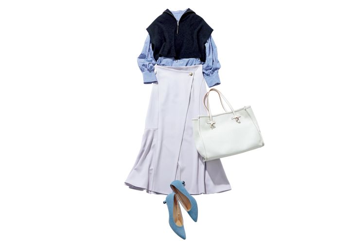 ジップニット付きワンピース(ニット)¥18,700/ノエラ ストライプブラウス¥8,990/PLST マーメイドスカート¥10,450/NATURAL BEAUTY BASIC トートバッグ¥69,300/ジャンニ キアリーニ(ジャンニ キアリーニ 銀座店) ブルーパンプス¥2,990/GU