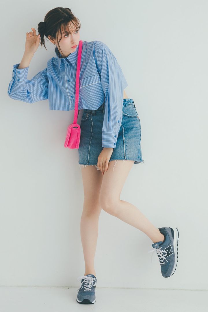 八木アリサ。ar4月号より 2WAYシャツ¥7,590/エモダ デニムミニ¥11,000/リーバイス®(リーバイ・ストラウス ジャパン) イヤリング¥2,640/ツリーピステ(ロードス) バッグ¥8,900/チャールズ&キース(チャールズ&キース ジャパン) シューズ¥11,990/ニューバランス(ニューバランスジャパンお客様相談室)