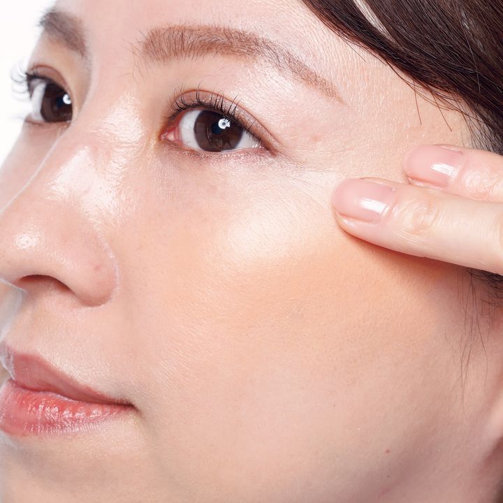 そばかすや薄いシミが出やすい目周り。目の下から目尻にかけてのCゾーンに右上のハイライトを指で塗り、ツヤと輝きでシミを目くらまし。重心アップでたるみも補整。