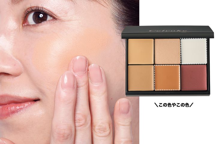右上・パレット:さまざまな悩みに特化した6色のカラー設計で点在するシミを簡単にカバーできて便利!今回は02の中間~やや暗めカラーを使用。明るめカラー01もあり。シームレスフェイスパレット02 ¥6,490(セルヴォーク)