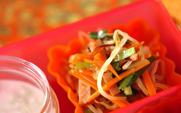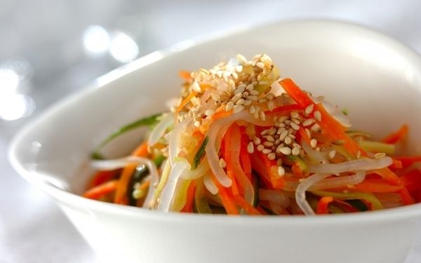 糸コンニャクのカロリーは100gあたり約6kcal。同量の春雨は342kcalなので置き換えるとヘルシーなサラダになりますよ。糸コンニャクは水分が出やすいため、乾煎りしてからドレッシングと和えるのコツ。味なじみが良くなるので、ぜひ試してみてください。