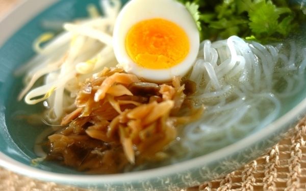 ビーフンやフォーの代わりに糸コンニャクを使う、ヘルシーなスープです。鶏もも肉の旨みたっぷりのスープに糸コンニャクがよく合います。低カロリーなので、ダイエット中の方にも最適。ザーサイやパクチーがたっぷりで満足感のある一杯です。