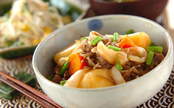 和食で人気の肉じゃがにも糸コンニャクは欠かせません。ジャガイモや玉ネギの甘み、牛肉の旨みを吸った糸コンニャクは、ご馳走級の美味しさです。煮汁が全体に行き渡るよう、落し蓋をしても良いですね。仕上げのバターでコクをプラスしましょう。