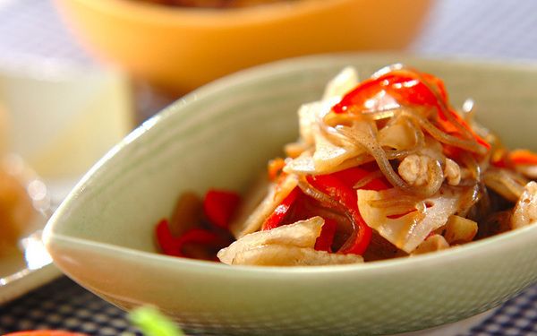 糸コンニャクとレンコン、新ゴボウなど食感の違う食材を組み合わせたきんぴらは、シンプルながら後を引く美味しさ。糸コンニャクは下茹でしてから炒め合わせるのがポイントです。コンニャク独特の臭みがなくなり、調味料がからみやすくなります。