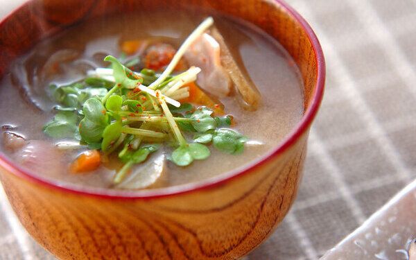 根菜やベーコンなど具だくさんのみそ汁に、糸コンニャクをプラス。食べ応えが増してもカロリーを抑えられるのが良いですね。一杯でおなかいっぱいになるので、朝食にもおすすめです。糸コンニャクは下茹でせず、熱湯をまわしかけるだけでよく、手軽に作れるのもポイント。