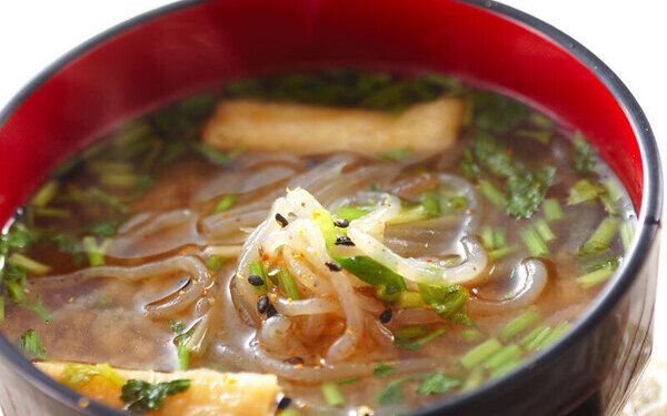 日本の伝統料理のひとつ、粕汁に糸コンニャクを使います。肉や魚は不使用、糸コンニャクと根菜、油揚げだけのシンプルな粕汁です。具材を鍋に入れて煮込むだけでよく、簡単に作れますよ。酒粕の芳醇な香りとだしがしみた糸コンニャクが絶品です。
