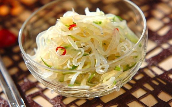涼し気な見た目が印象的な酢の物は、揚げ物や炒めもののようなしっかり味の主菜に合わせると◎。プリプリとした糸コンニャクにキュウリや甘酢ショウガがよく合います。チリメンジャコの塩気と甘酢のバランスが格別で、箸が進むこと間違いなしですよ。
