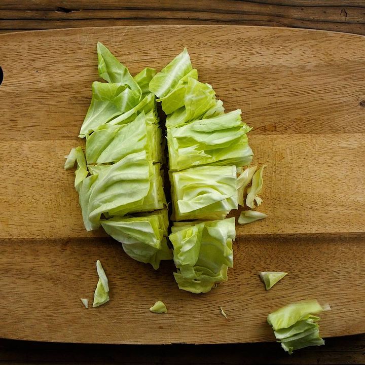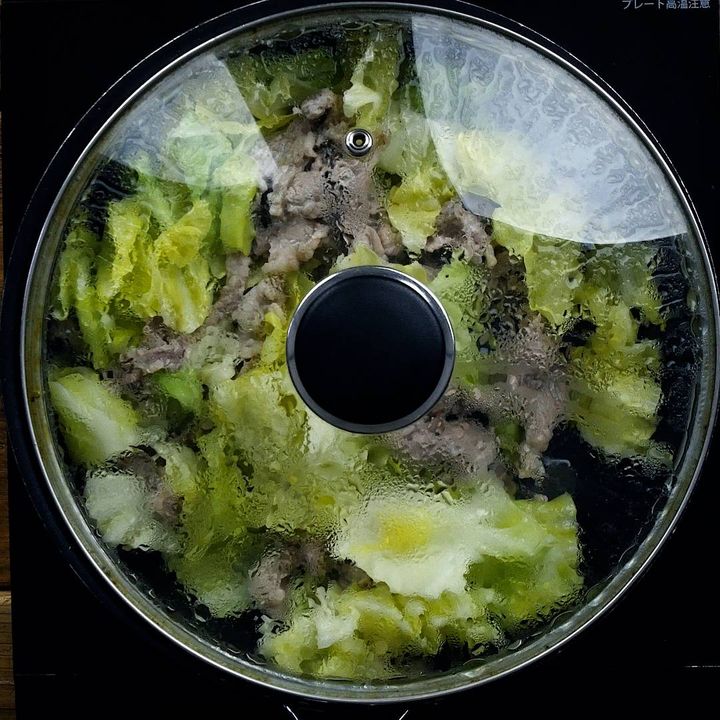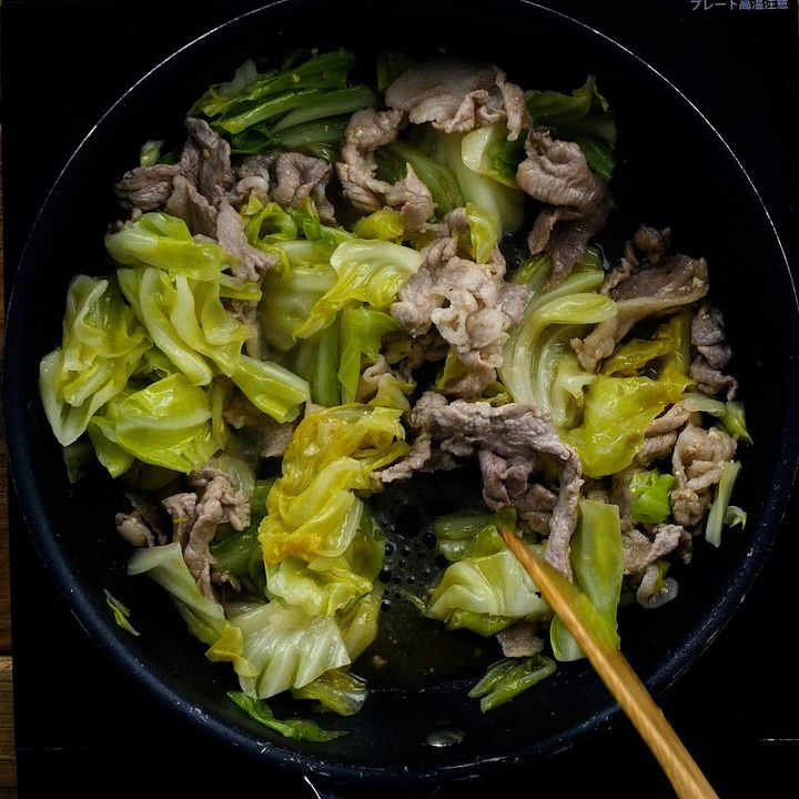 6: 肉が白っぽくなってきたらキャベツを加え、フタをして2分蒸し焼きにします。