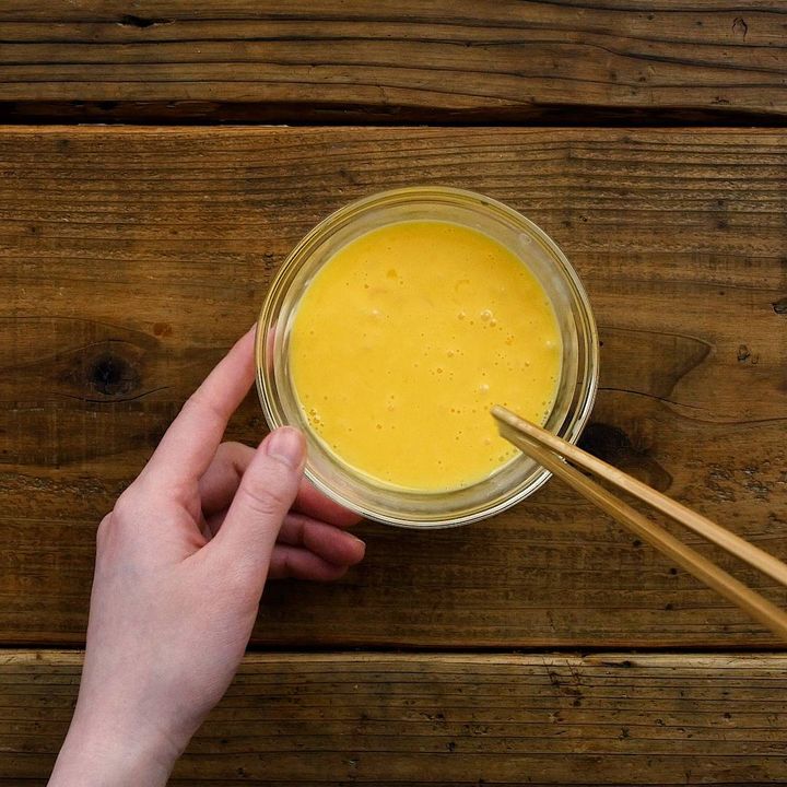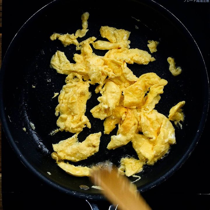 4: フライパンにごま油(半量)を加えて中火で熱し、よく温まったら③の卵液を加えます。ふちが固まってきたらやさしくかき混ぜ、炒り卵にして一度取り出します。