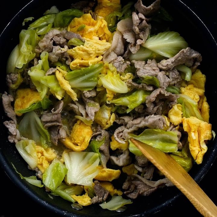 ふんわり卵がおいしい。春キャベツと豚肉の中華炒め