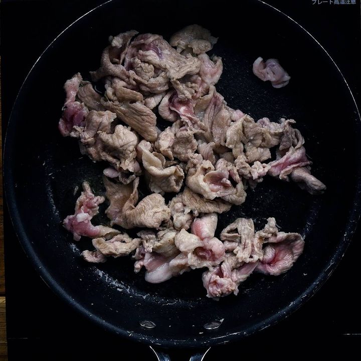 5: 同じフライパンにごま油(半量)を加えて中火で熱し、豚こま肉を加えます。