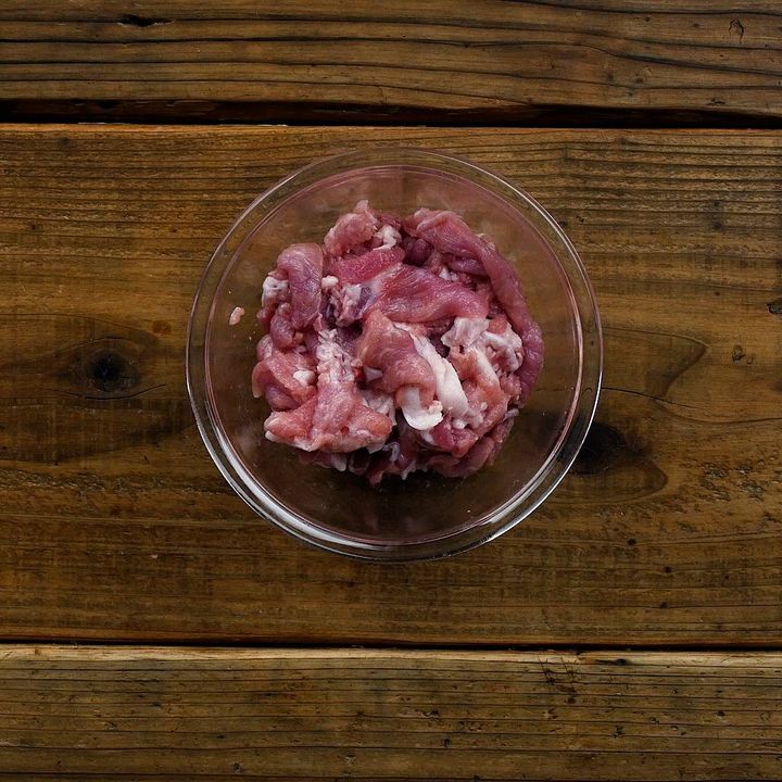 2: 豚こま肉をボウルに入れ、味付塩こしょう、酒を加えてよく揉み込みます。