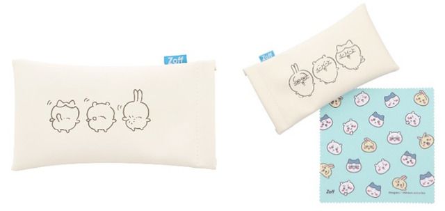 すべのフレームにオリジナルケースとメガネ拭きがセットになっていました。メガネをかけたZoffオリジナルのちいかわたちをあしらったソフトケース。フレームとおそろいの顔もプリントされている総柄のクロスがキュート。