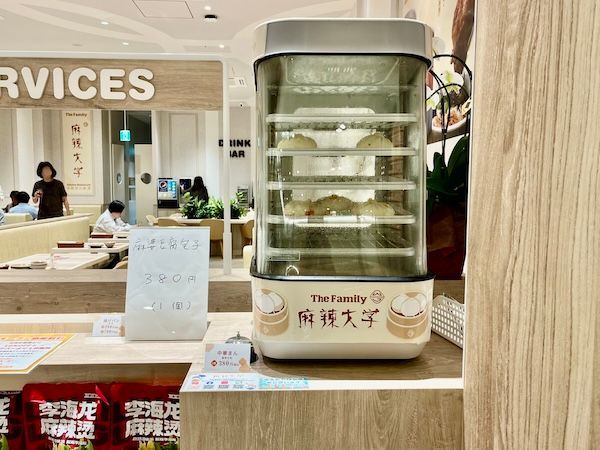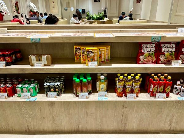 お店の入り口には、テイクアウトできる肉まんもありました。本場のお茶や調味料のセレクションも本場そのもの。購入できるようです。赤い缶のお茶は薬草系ドリンクだそう。梅やココナッツのドリンクなど試してみたいものがいろいろありました。今後はお惣菜なども並ぶかもしれないのだとか。 スタッフの方が美味しいとおすすめのジャスミンティーを購入。ボトルも美しいですよね?