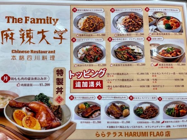 近隣では勝どきのトリトンスクエアでも人気の麻辣大学。ファミリーにも使い勝手よく、おしゃれなカフェのような空間が自慢のららテラスハルミフラッグ店にも訪れてみてくださいね。