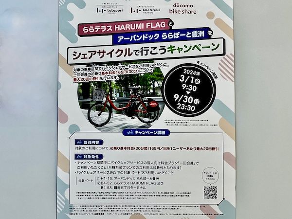「ららテラス HARUMI FLAGとアーバンドック ららぽーと豊洲をシェアサイクルで行こうキャンペーン」が、9月30日まで開催中みたいです。対象の乗車区間でバイクシェアサービスを利用すると、初乗り基本料金165円(30分)/ 回をユーザーあたり最大20回割引されるとか。(詳細は公式HPへ)この機会に利用してみては?