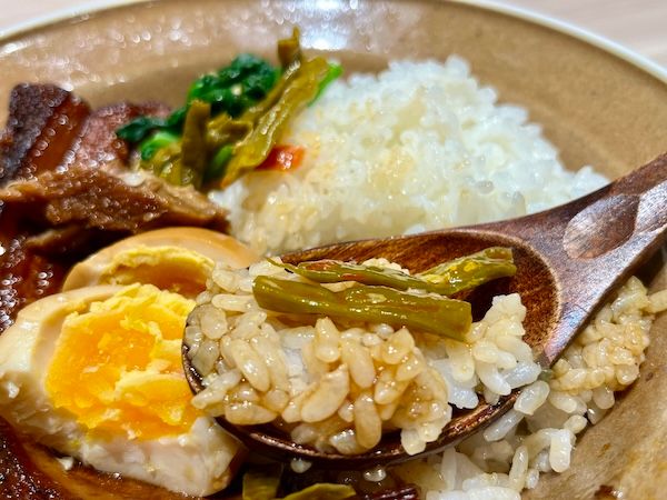 トロッと甘い脂と食感はしっかり残った甘辛味の豚バラ。そのつゆの染みたご飯。この懐かしい感じもするコリコリの漬物も、見た目通りの味わいに夢中で食べ尽くしました。ご飯も残さず完食。不思議と胃もたれなし。また食べたい味です。香りも味わいも本場の味で大満足。