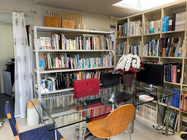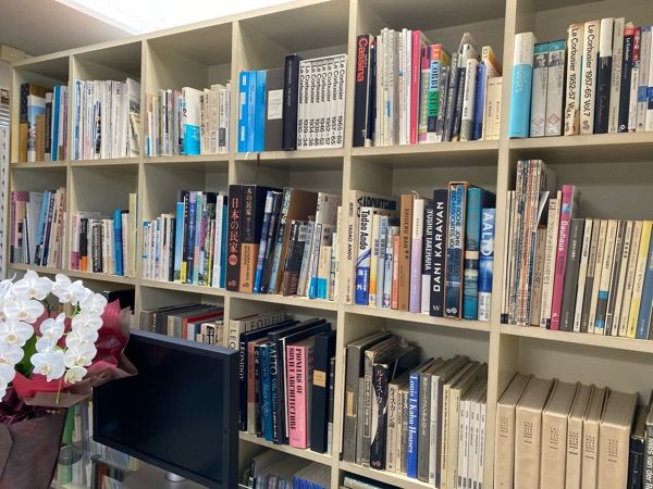 靴を抜いで、入って右側には、少人数で集まれるテーブルと椅子があり、その周りには、デザインや建築関係の書物が並んでいます。