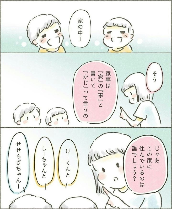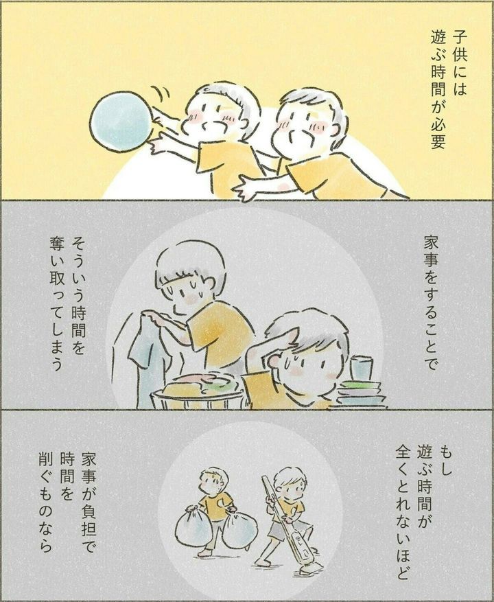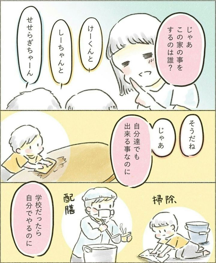 子どもは遊ぶことや勉強することが仕事ですが、それ以上に家で一緒に暮らす人として、家事を覚えてほしいと考えるせせらぎさん。家族で分担して一緒に家事をやることで、子どもにとってもプラスの学びはあるはずですよね。