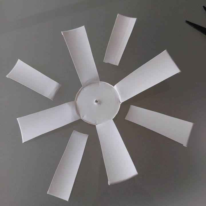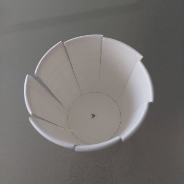 1つの紙コップを8等分で印をつけ、ハサミで切り込みを入れます。