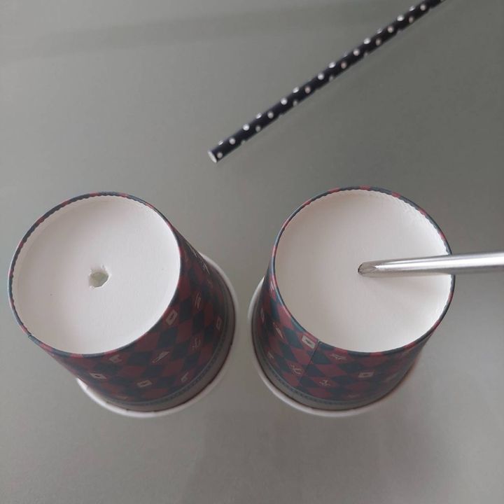 紙コップ(2つとも)の底の真ん中にドライバーなどで穴をあけます。