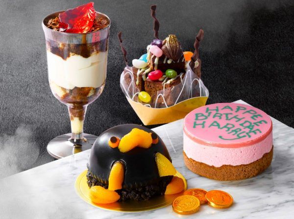 (ハグリッドのバースデーチーズケーキ(前・右)、ニフラーのチョコレートムース(前・左)、賢者の石のティラミス(後ろ・左)、ブラウニーボックス(後ろ・右))