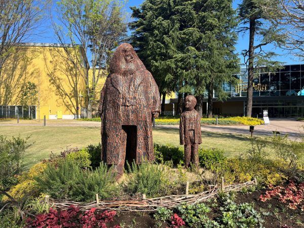 最寄り駅から施設の入口に進む途中の屋外エリアは公園になっていて、「ハリー・ポッター」にちなんだオブジェが並んでいます。